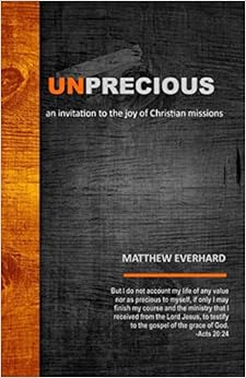 "Un-Precious: An Invitation to the Joy of Christian Missions" is a short booklet about Christian missions and evangelism. Designed for individual study or for use with short-term mission teams, each of these six brief chapters comes with study questions to stimulate thoughtful discussion. In these short chapters, each of which can be read in one sitting, Pastor Matthew Everhard guides the reader through such topics as: our purpose in life, the Fall and the human condition, the glory of the gospel of Jesus Christ, the urgency to proclaim the gospel to unreached people groups, and our responsibility to respond to the missionary calling.